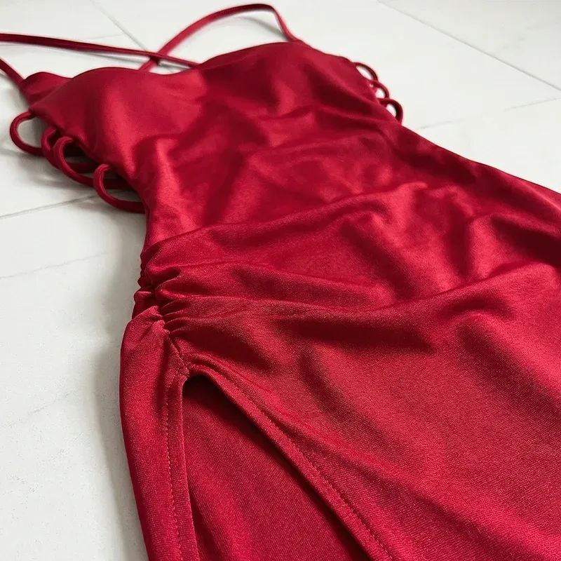 Cette robe associe audace et élégance, parfaite pour une soirée. Le design dos nu apporte une touche sensuelle, renforçant le charme global. Les bretelles spaghetti dessinent une silhouette délicate et féminine, équilibrant harmonieusement les détails audacieux. Confectionnée dans des matières de haute qualité, elle assure un confort tout au long de la soirée. Associez la robe à des talons élégants et des accessoires pour compléter ce look captivant.