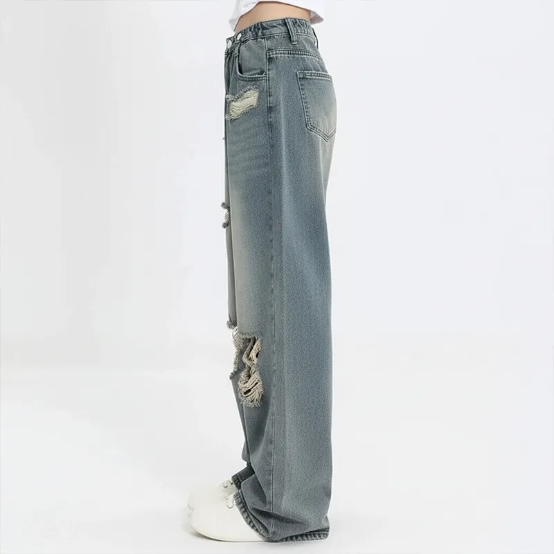 Jean déchiré femme coupe ample taille haute